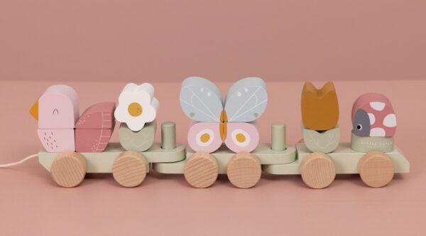 Der wunderschöne und besondere Holzzug aus der Kollektion Flowers & Butterflies von Little Dutch macht nicht nur riesigen Spaß, sondern ist auch noch sehr hübsch und dekorativ im Kinderzimmer. Der kleine Zug besteht aus insgesamt drei Wagons mit verschiedenen einzelnen Holzklötzen. Auf den Wagons befinden sich jeweils ein Vogel, ein Schmetterling, ein Marienkäfer und zwei Blumen. Außerdem hat der Zug vorne auch eine kleine Schnur, sodass dein Kind den Zug auch hinter sich herziehen kann. Der Holzzug ist ein echter Klassiker unter den Kleinkind Spielzeugen und eine schöne Kinderzimmer Dekoration.